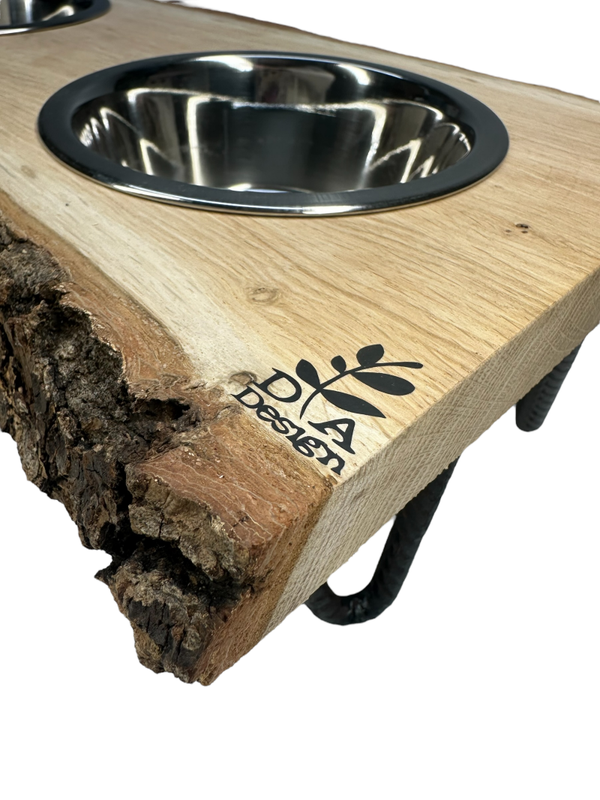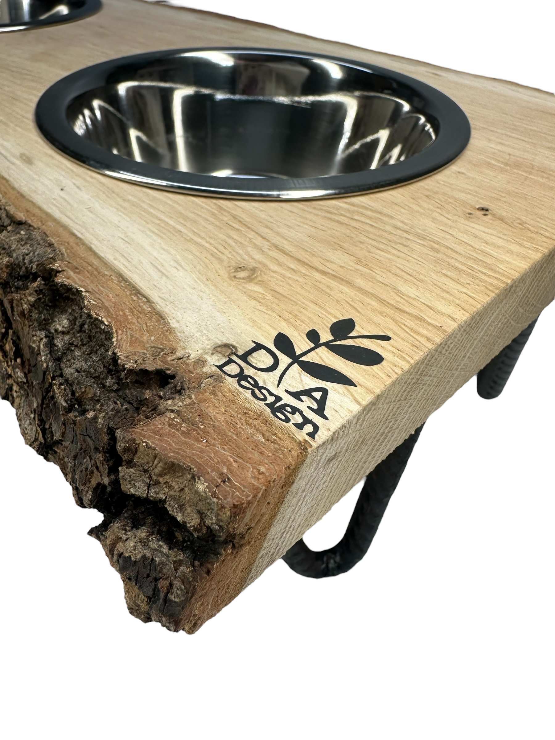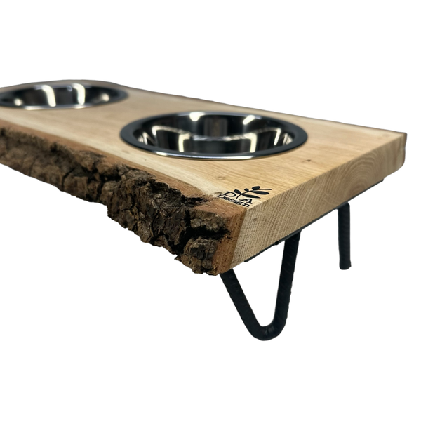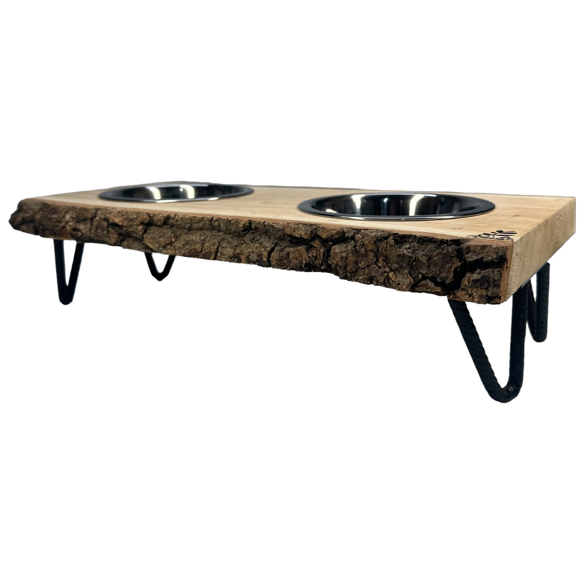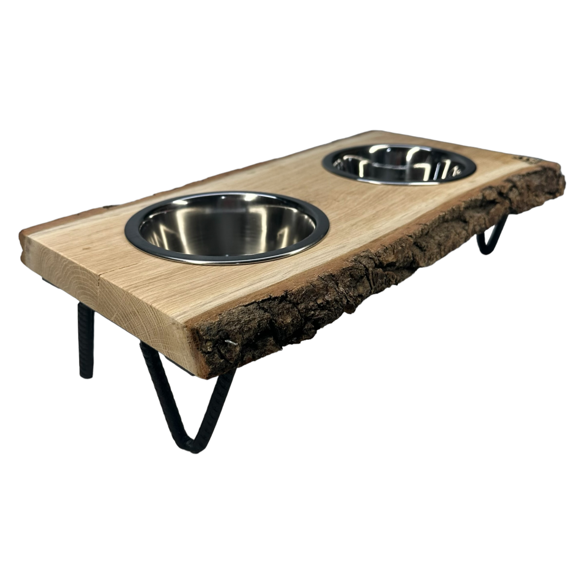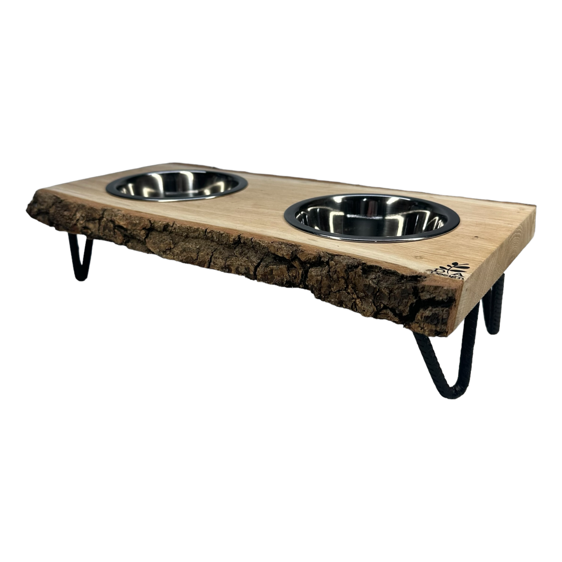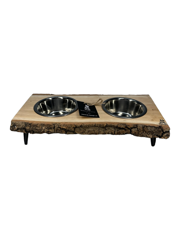 Mooie voerbak van massief eikenhout met boomschors en stalen poten.