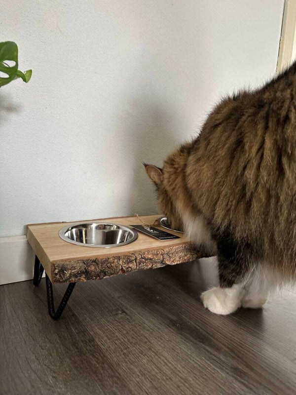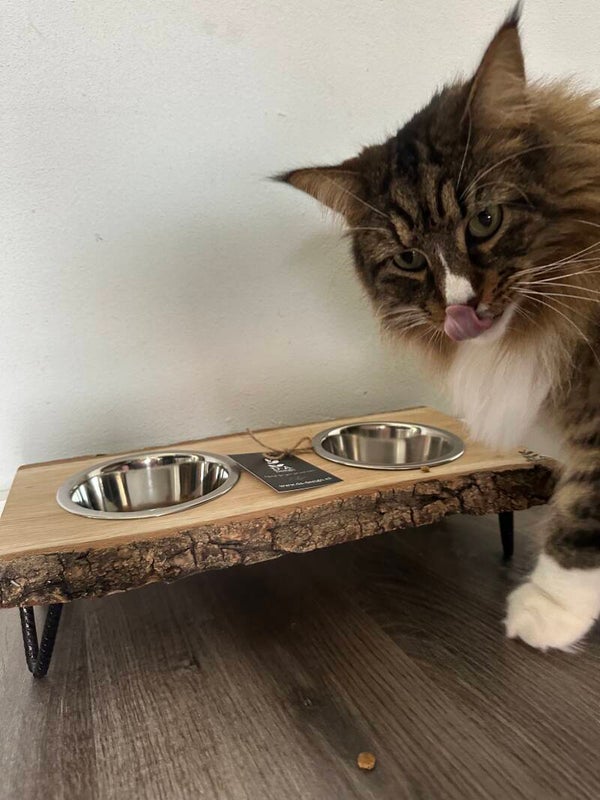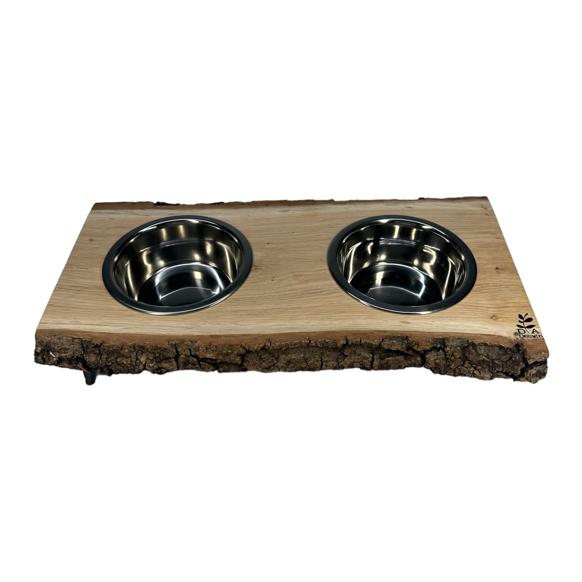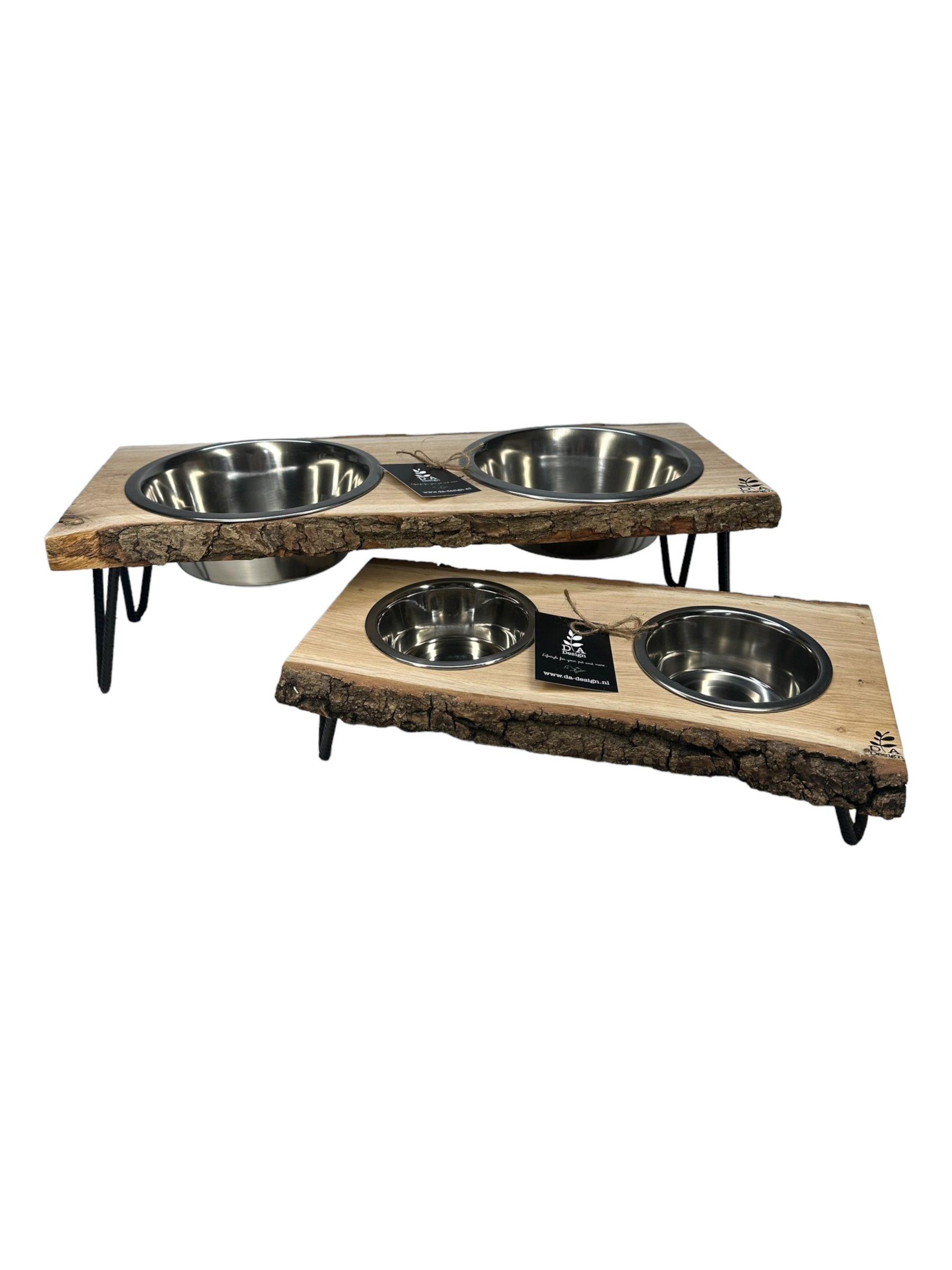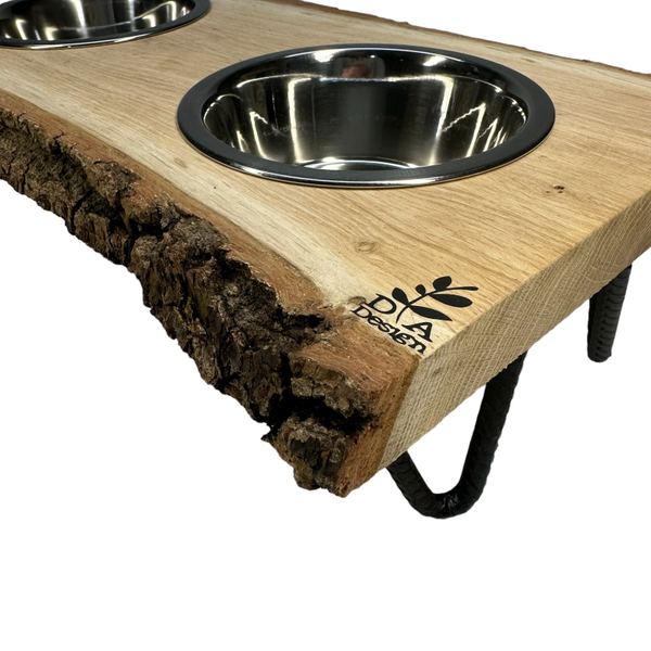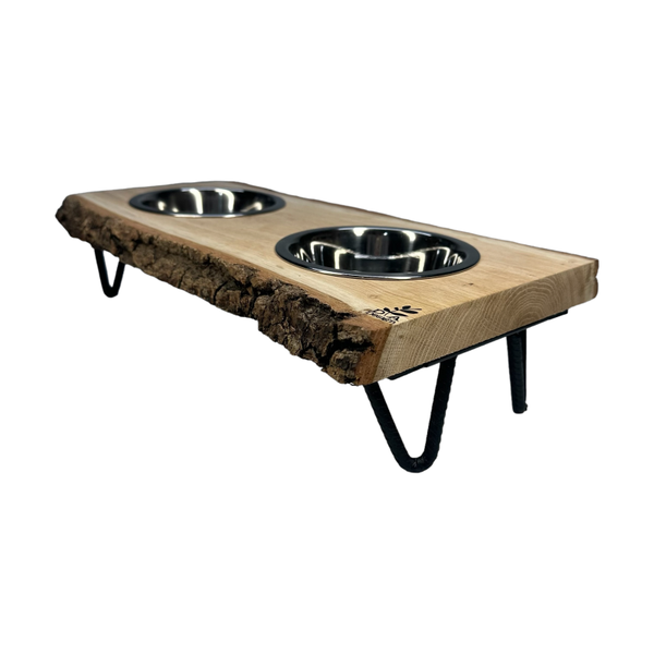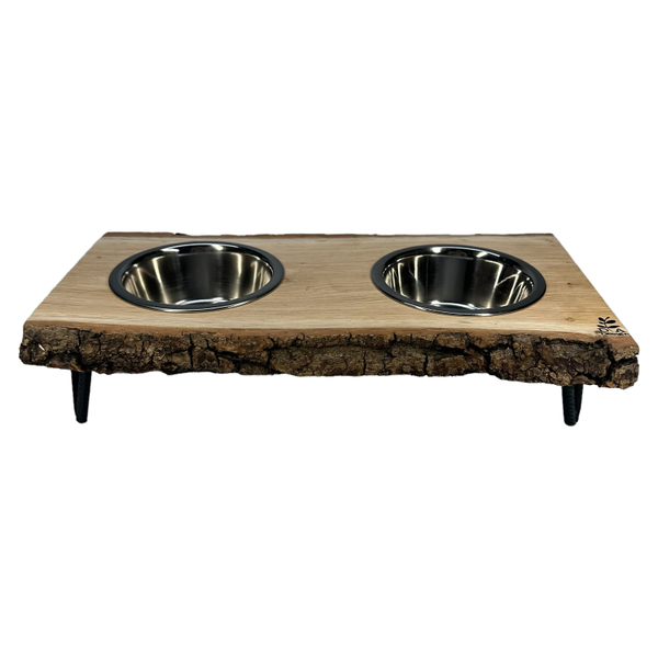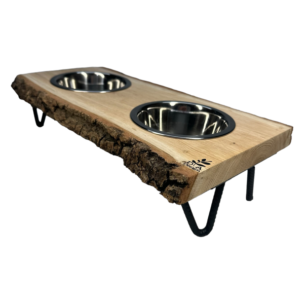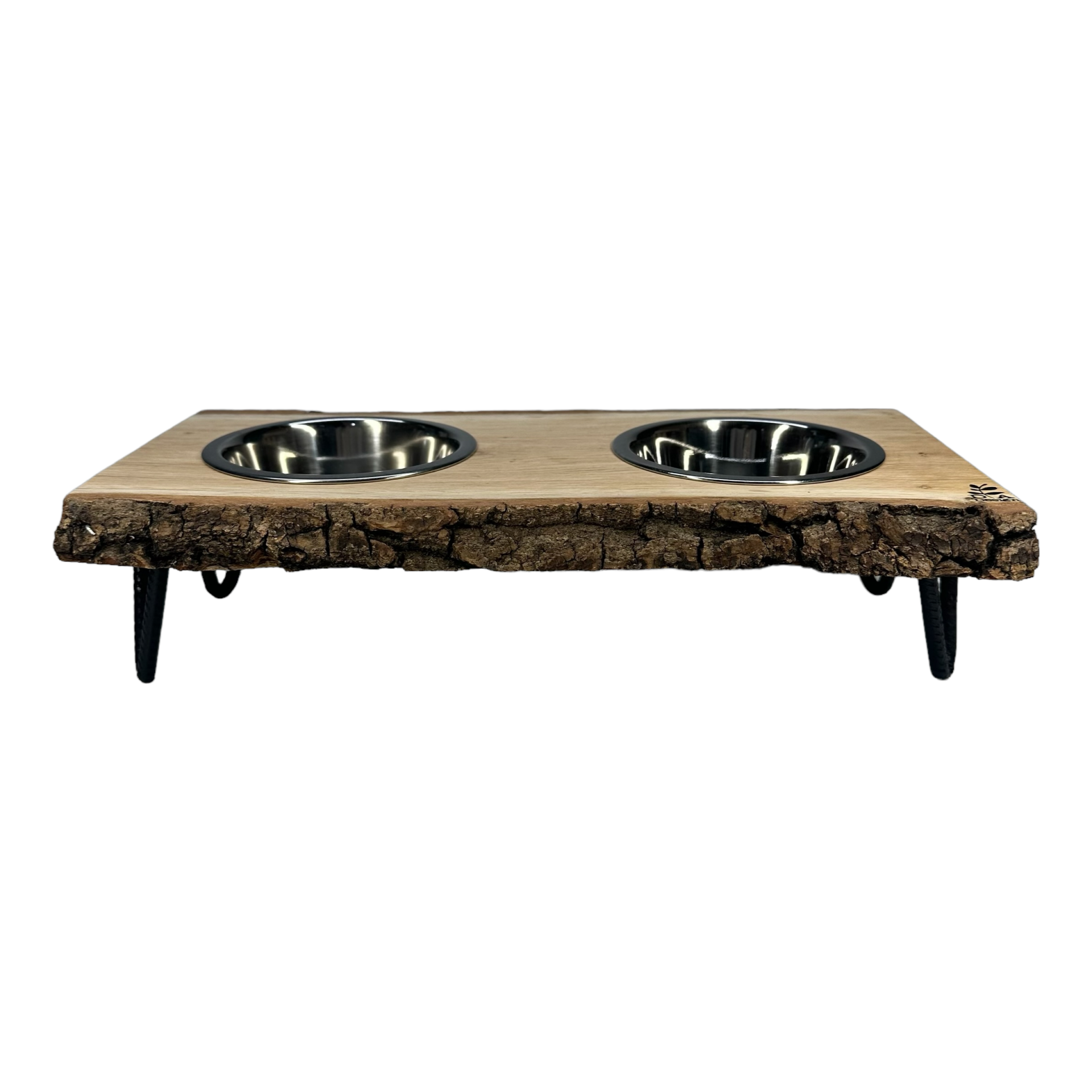 Mooie voerbak van massief eikenhout met boomschors en stalen poten.