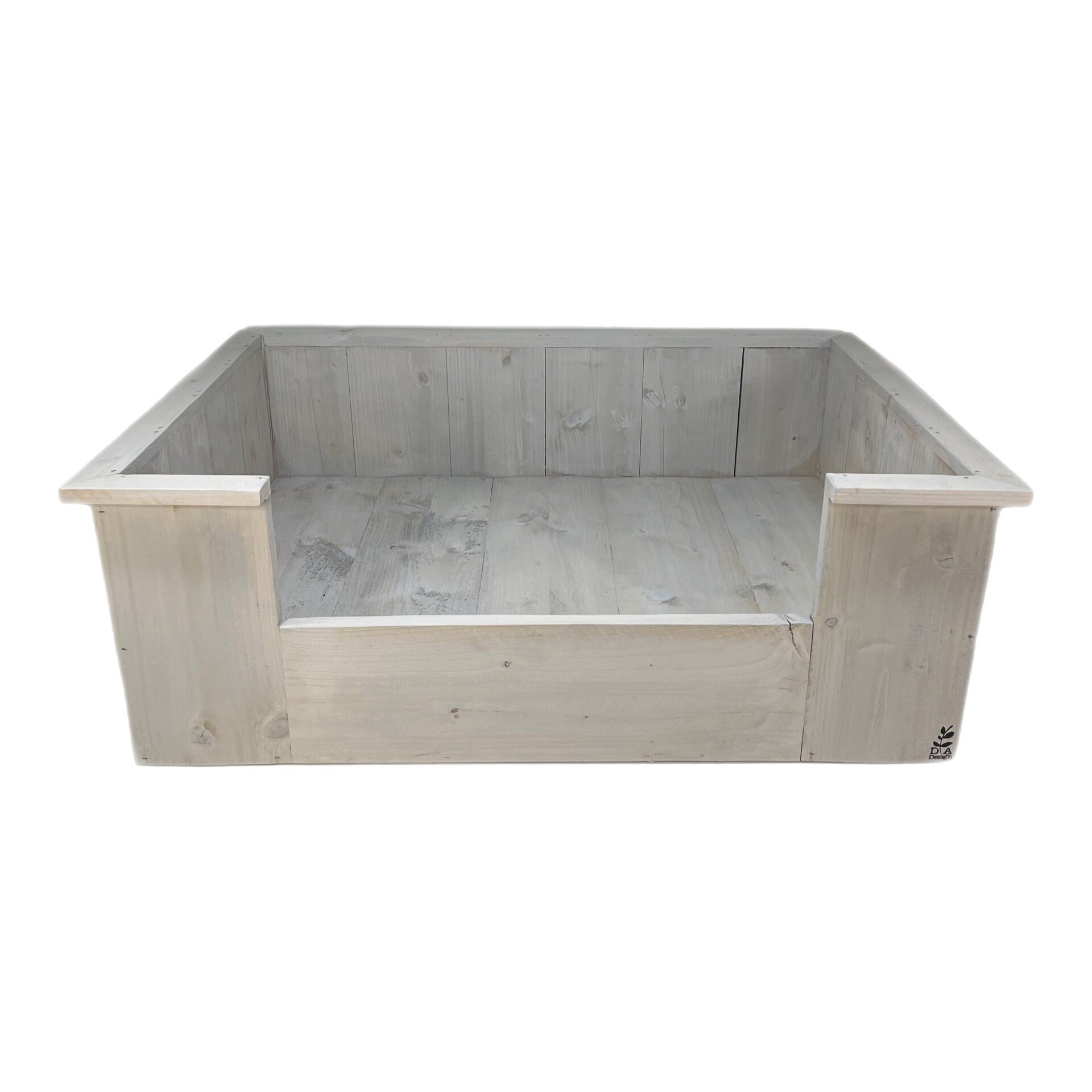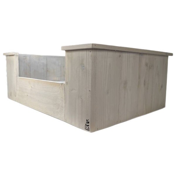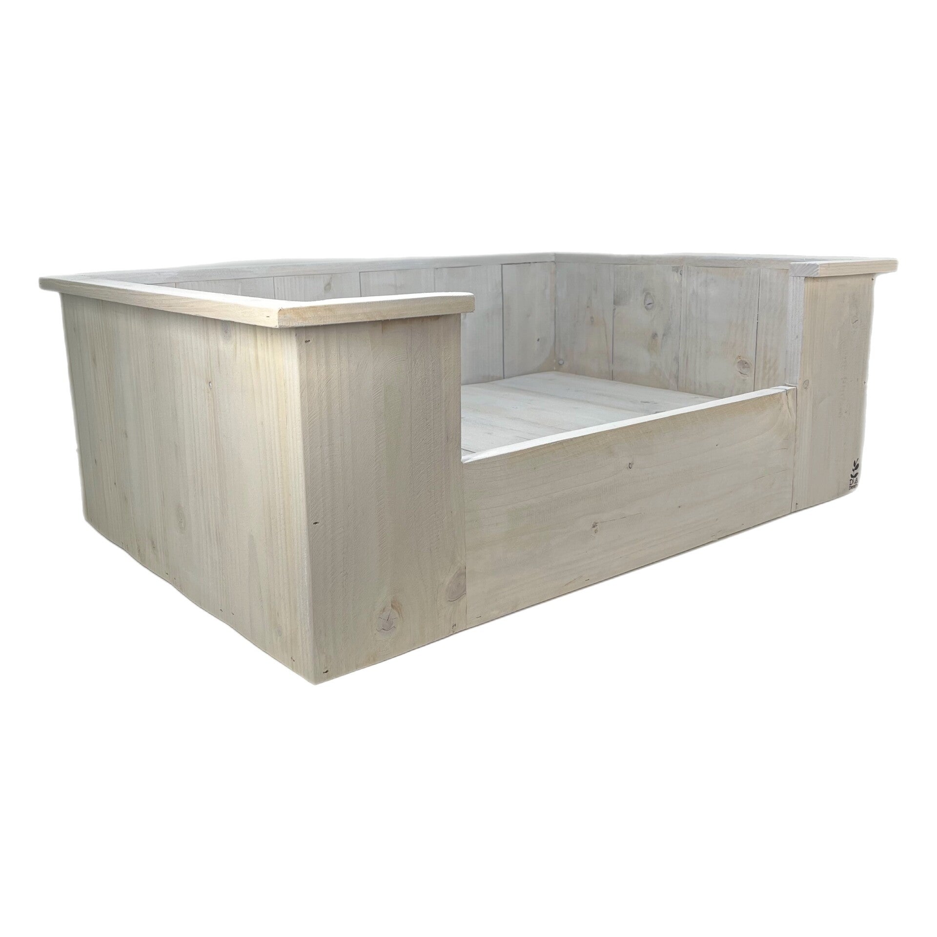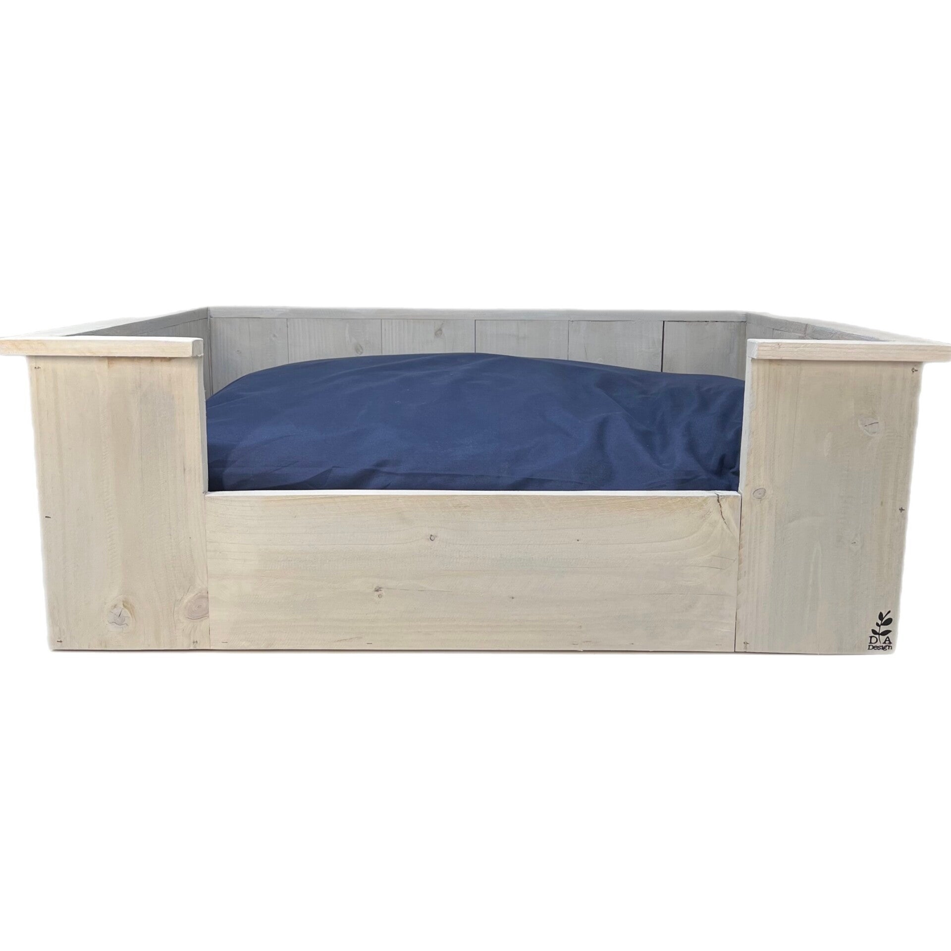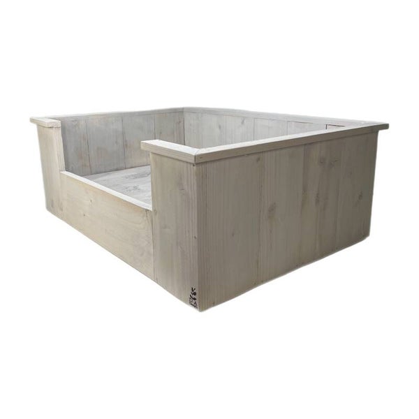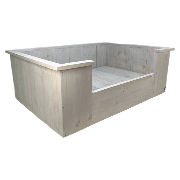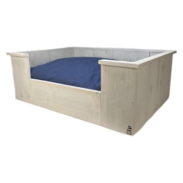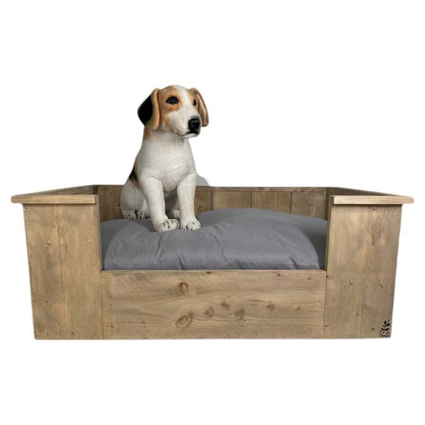 Een mooie hondenmand van steigerhout, met kussen.