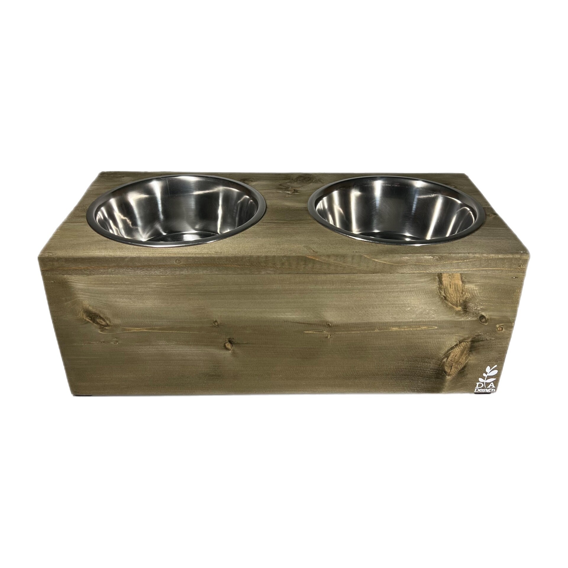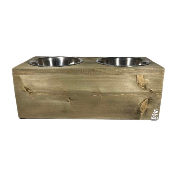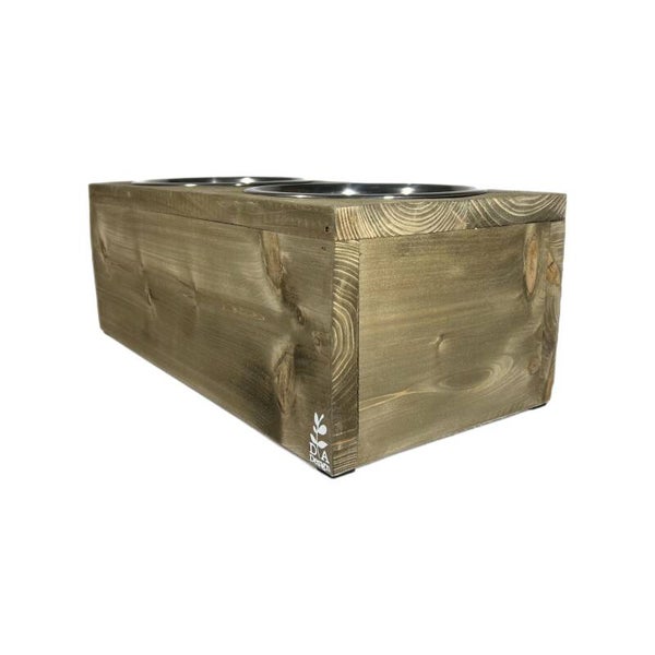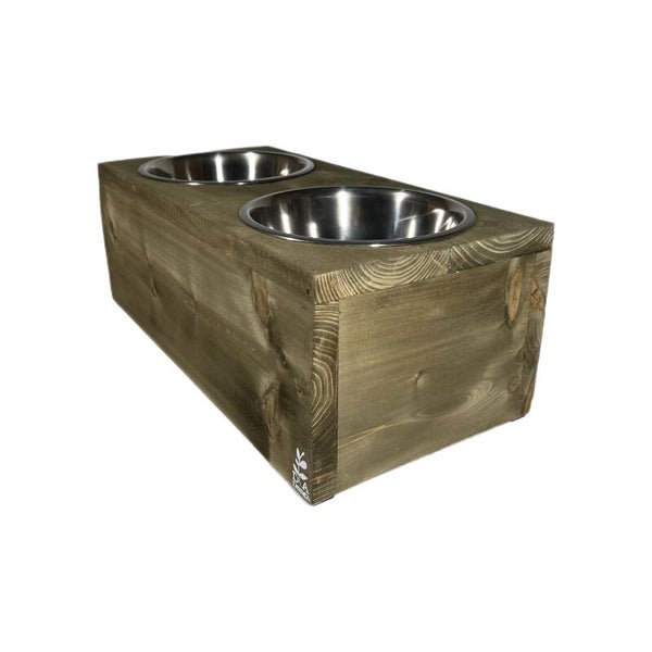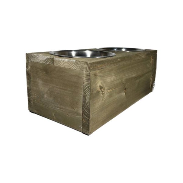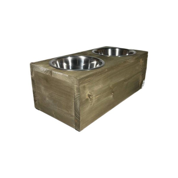 Mooie steigerhouten voerbak voor een grotere hond.