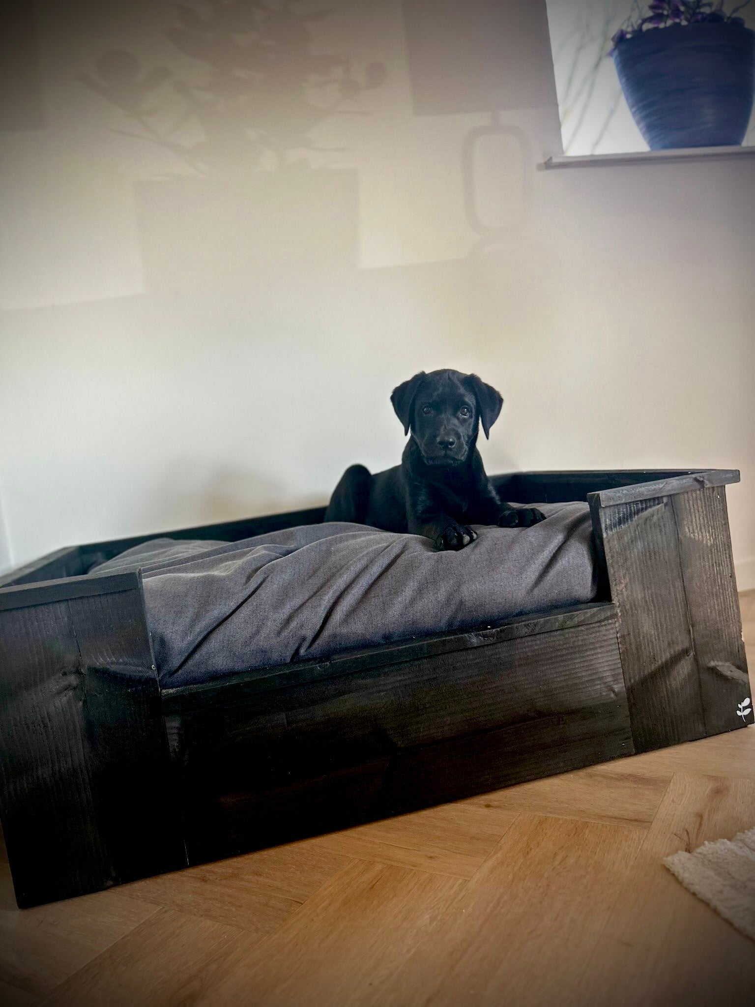 Een mooie hondenmand van steigerhout met kussen.